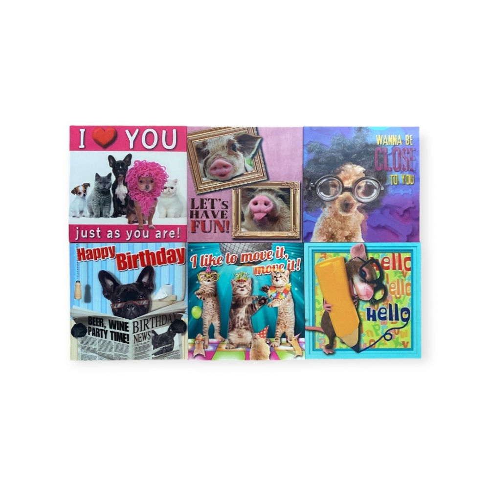 6 lekre doble 3D-kort med konvolutt, morsomme dyremotiv.