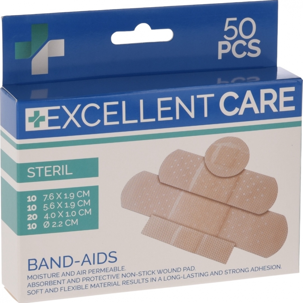 Velasortert utvalg av sterile plaster. 10 stk 7,6x1,9 cm, 10 stk 5,6x1,9 cm, 20 stk 4,0x1,0 cm, 10 stk runde 2,2 cm i diameter. Plastrene er pustende og vannavstøtende, laget av mykt materiale og lim som sitter godt.