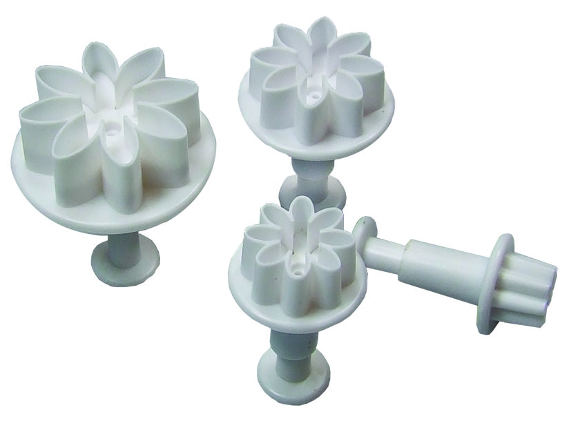 Utstikksform i 4 forskjellige størrelser, med ejektor, som gjør det enkelt å trykke ut figuren. Egner seg til marsipan og annet. Gir flotte blomstermønster, på ca. 1,5-2-3 og 4 cm