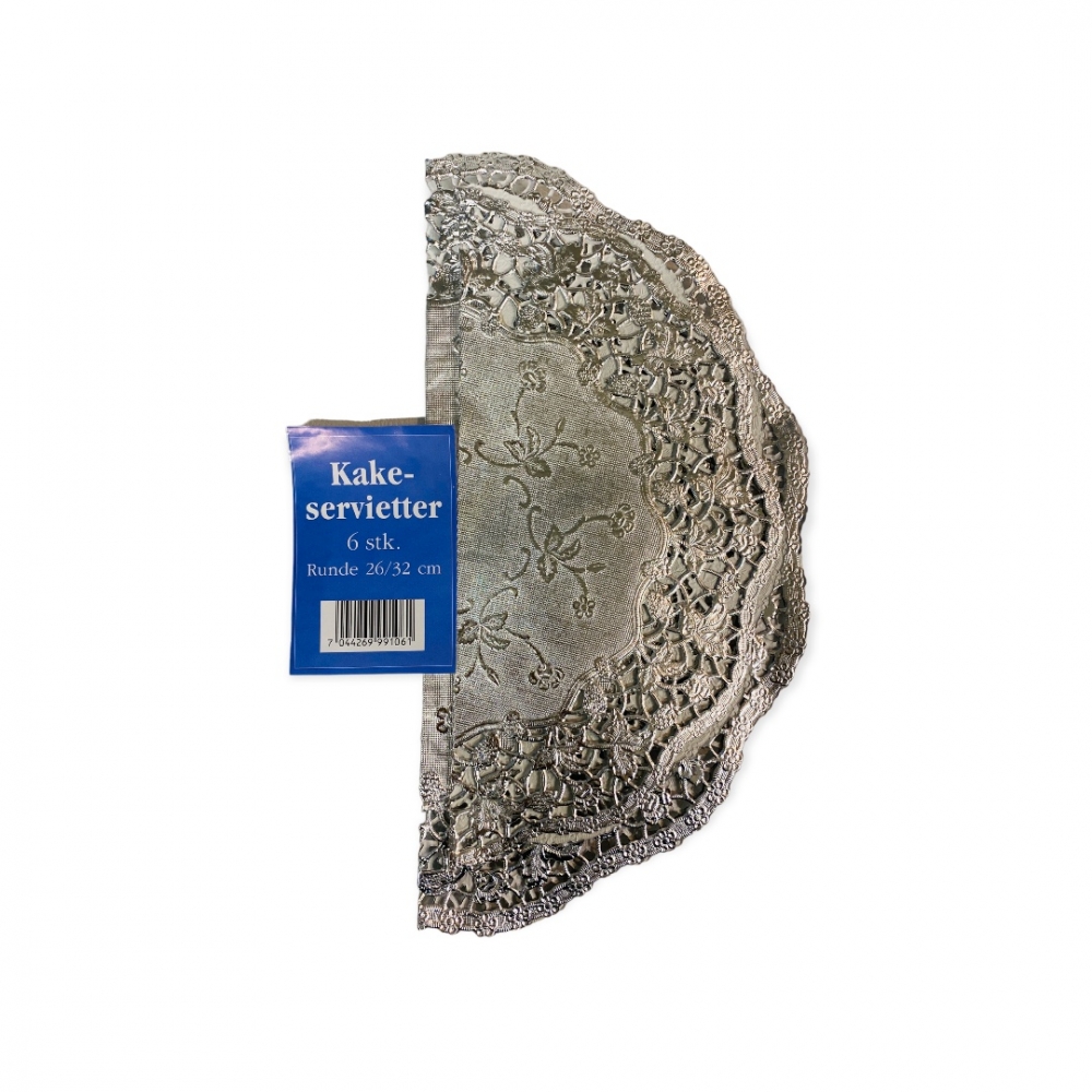 Kakeservietter runde sølvfarget 26/32 cm 6 pk. (Innerkartong 10 stk)