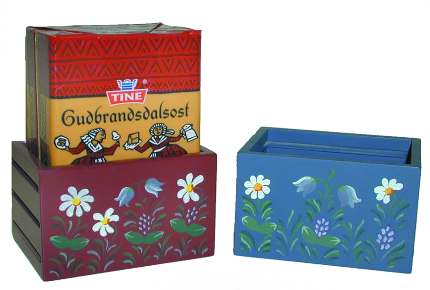 Meget dekorativ og praktisk kasse i tre, til oppbevaring av brunost, kan justeres etterhvert som osten blir mindere. Velg mellom burgunder og blå.
