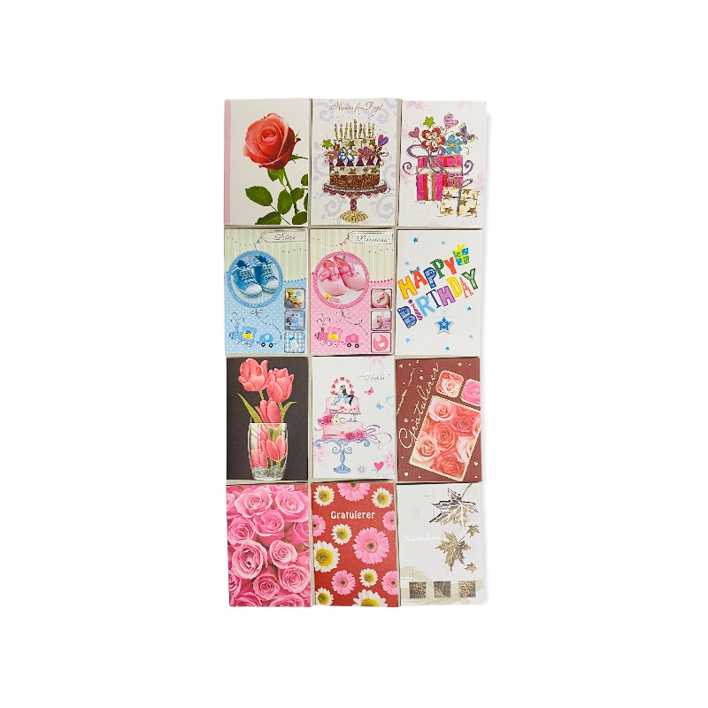 Gratulasjonskort doble med konvolutt 24 stk. E3 med oppheng (Innerkartong 1 assortiment)