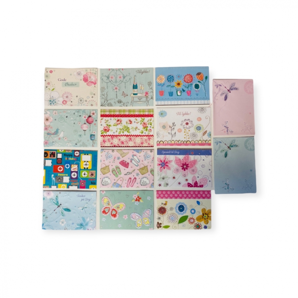 24 ass. småkort 7x10 cm, 12 forskjellige motiv, 2 av hvert motiv. Det blir da kun kr. 3,50 pr. kort. Kommer på prakrisk strips med opphengskrok, kan henges opp mange steder i butikken!