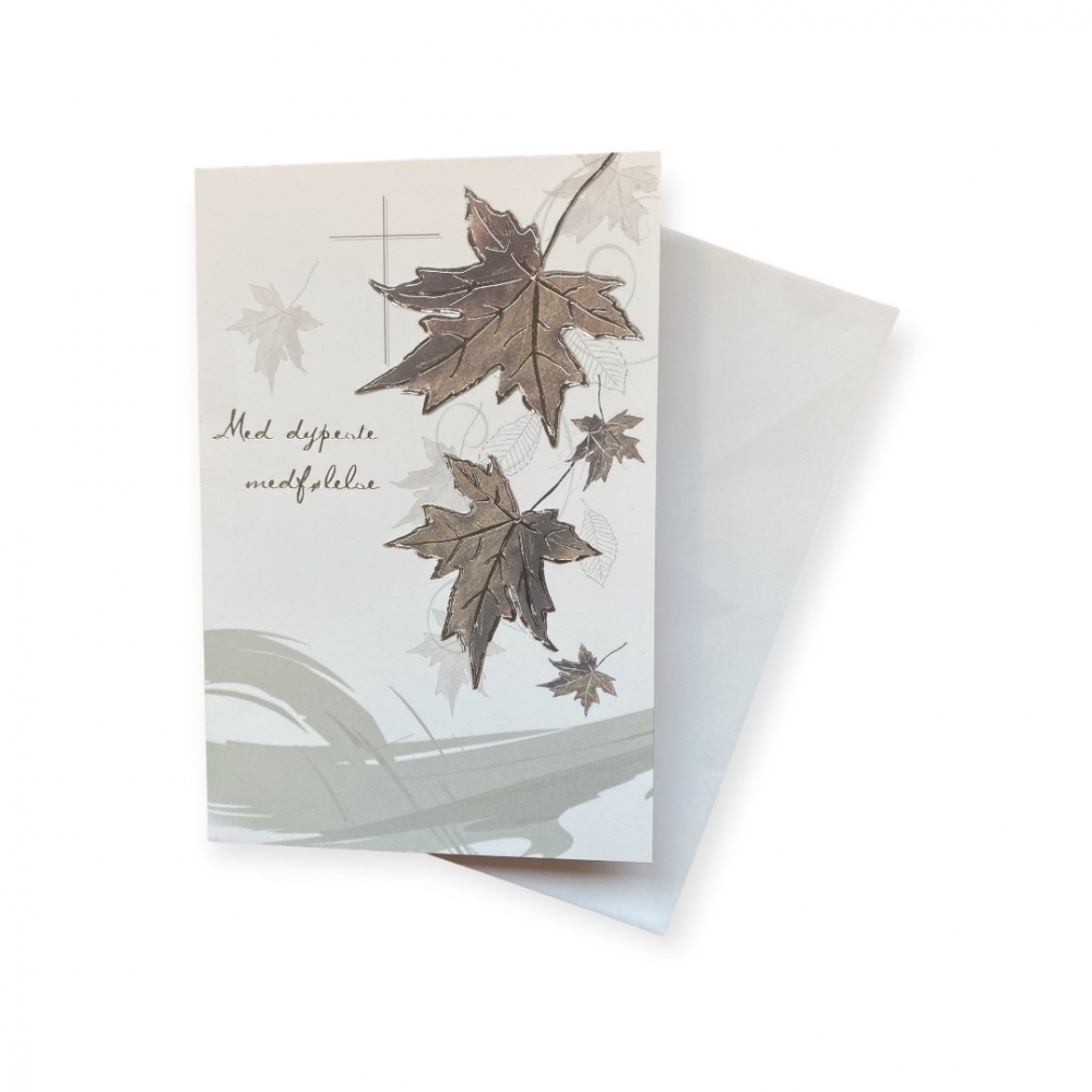 kondolansekort dobbelt med konvolutt (Innerkartong 6 stk) PrisNOK7,50 ekskl. mva. Kjøp Lekkert kondolansekort med høstblader og sølvfargede detaljer. Tekst: Med dypeste medfølelse. Nøytral innside