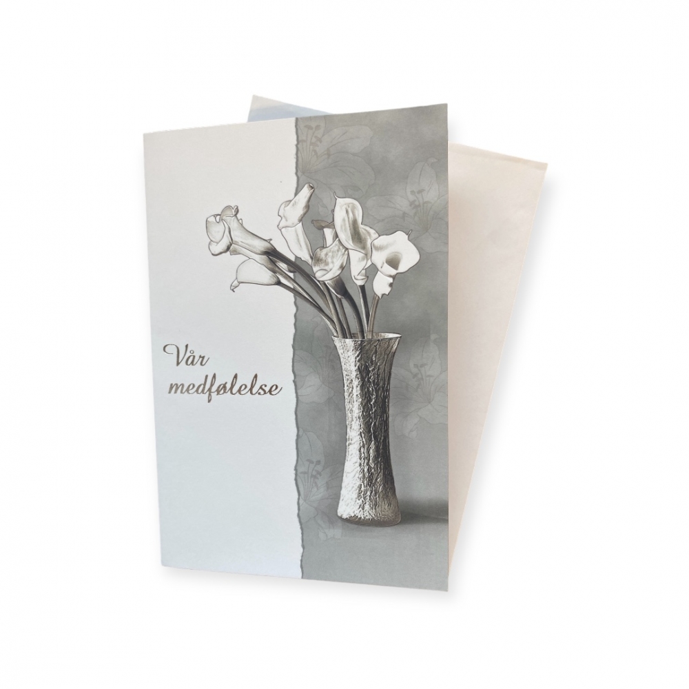 Kondolansekort dobbelt med konvolutt (Innerkartong 6 stk) PrisNOK7,50 ekskl. mva. Kjøp Lekkert kondolansekort med liljer og sølvfargede detaljer. Tekst: Vår medfølelse. Nøytral innside