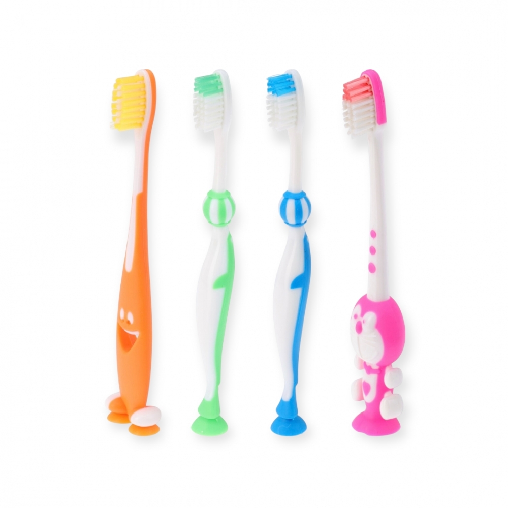 Koselig sett med to store(16,5cm) og to små(14,5cm) tannbørster. Alle tannbørstene har praktiske sugekopper på undersiden så de enkelt kan festes til egnet underlag.