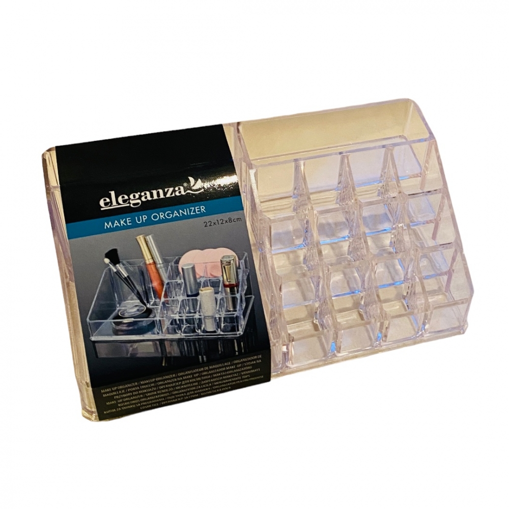 Oppbevaringsboks med rom i forskjellige størrelser hvor du kan organisere sminken. Laget i gjennomsiktig akrylplast. 22x12x8 cm