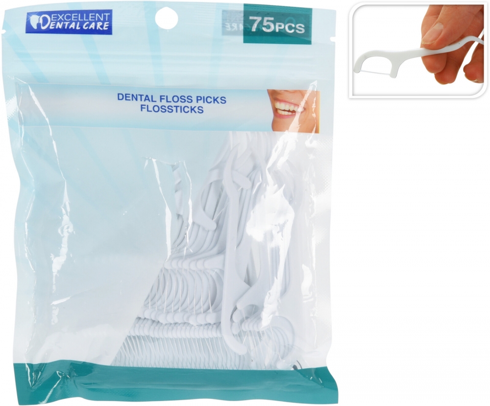 Stor pakke med hele 75stk flosssticks som er en kombinasjon av tanntråd og tannpirker.