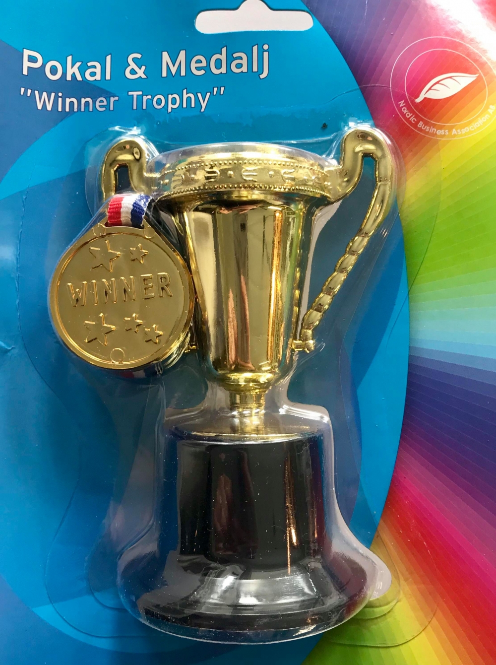 Liten pokal og medalje med bånd i rødt, hvitt og blått.