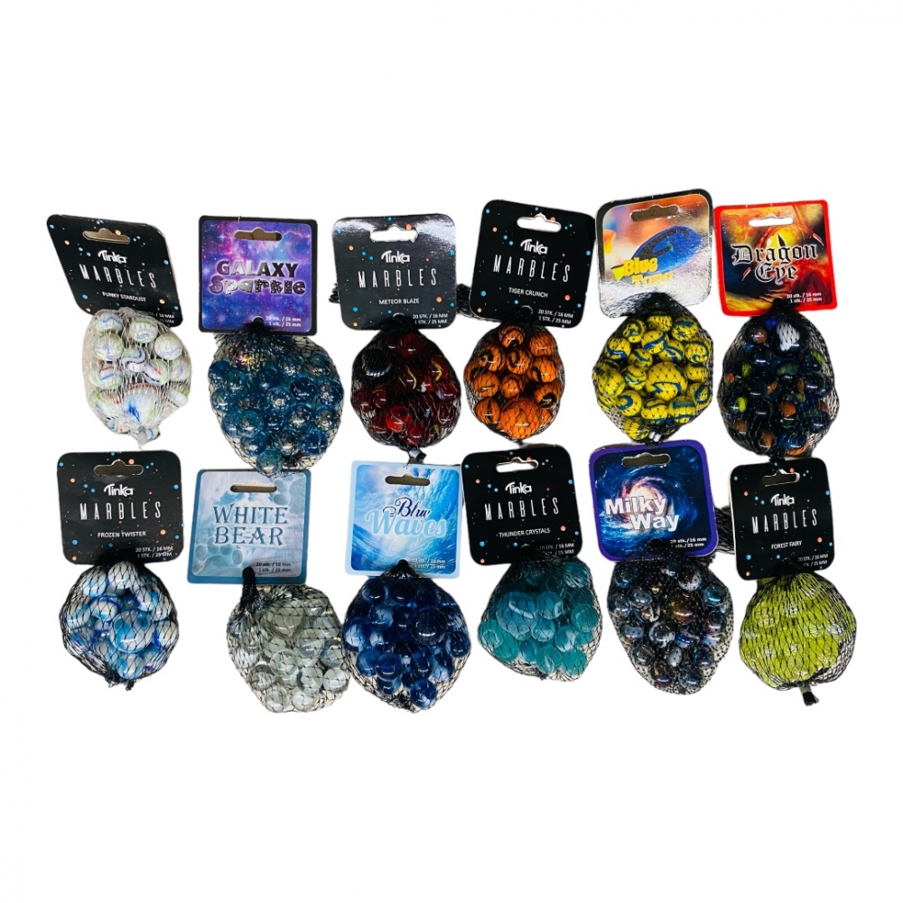 Flott sett med klinkekuler fra Tinka, som består av 1 kule på 25mm og 20 kuler på 16mm De kommer mange fargenyanser. De blir sendt med tilfeldige farger.