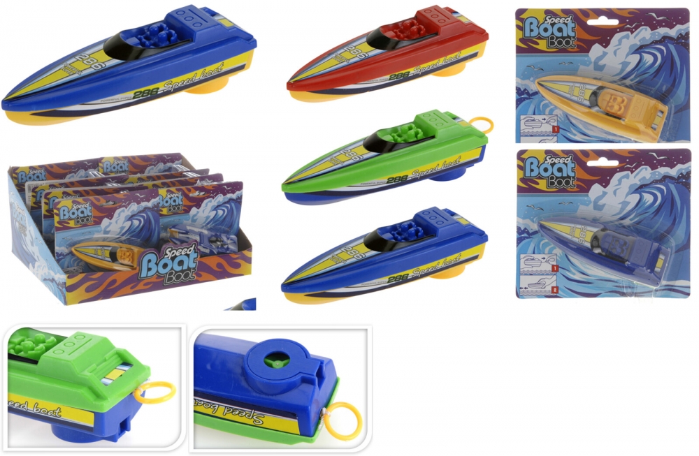 Morsom båt med opptrekk. Trekk i snoren og båten kjører av gårde. Ca. 14 cm