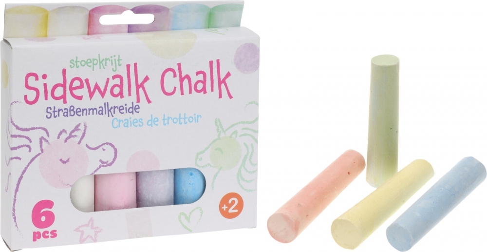 6 gatekritt i ulike farger til å dekorere på asfalt, heller og lignende. Går vekk i regn eller kan vaskes enkelt bort. Fra 2år