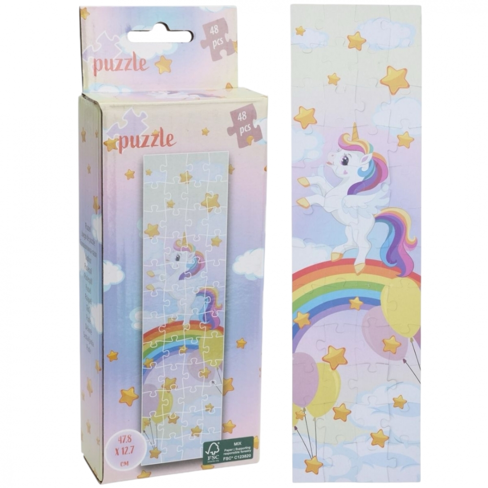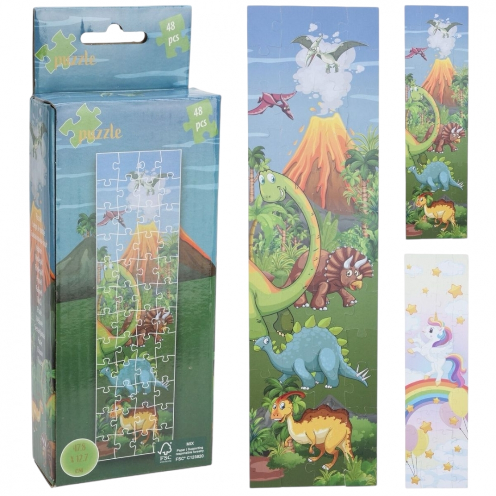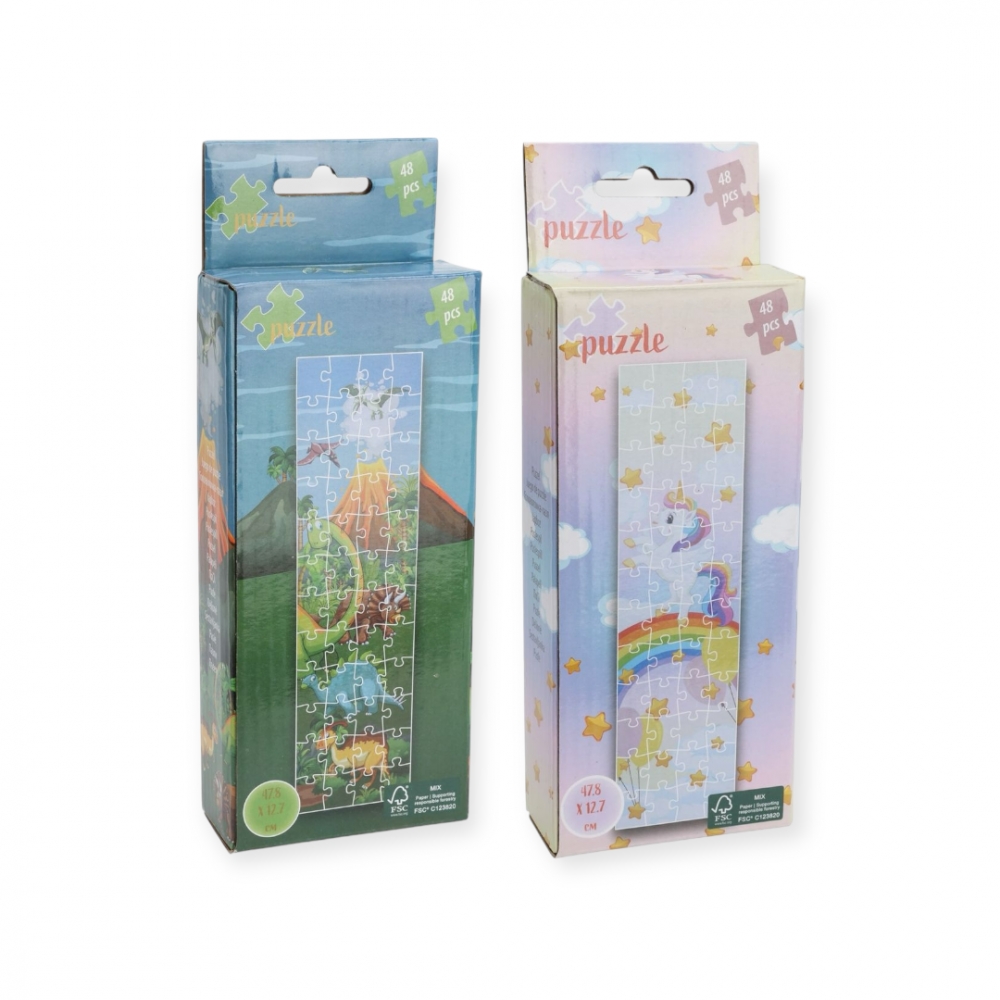 Puslespill 48 deler Enhjørning/Dinosaur (Innerkartong 12 stk) PrisNOK14,00 ekskl. mva. Kjøp Avlangt lite puslespill på 48 brikker. Motiv av dinosaur eller enhjørning Når puslespillet er lagt ferdig får det størrelse ca 48x13cm Kommer med oppbevaringsboks.