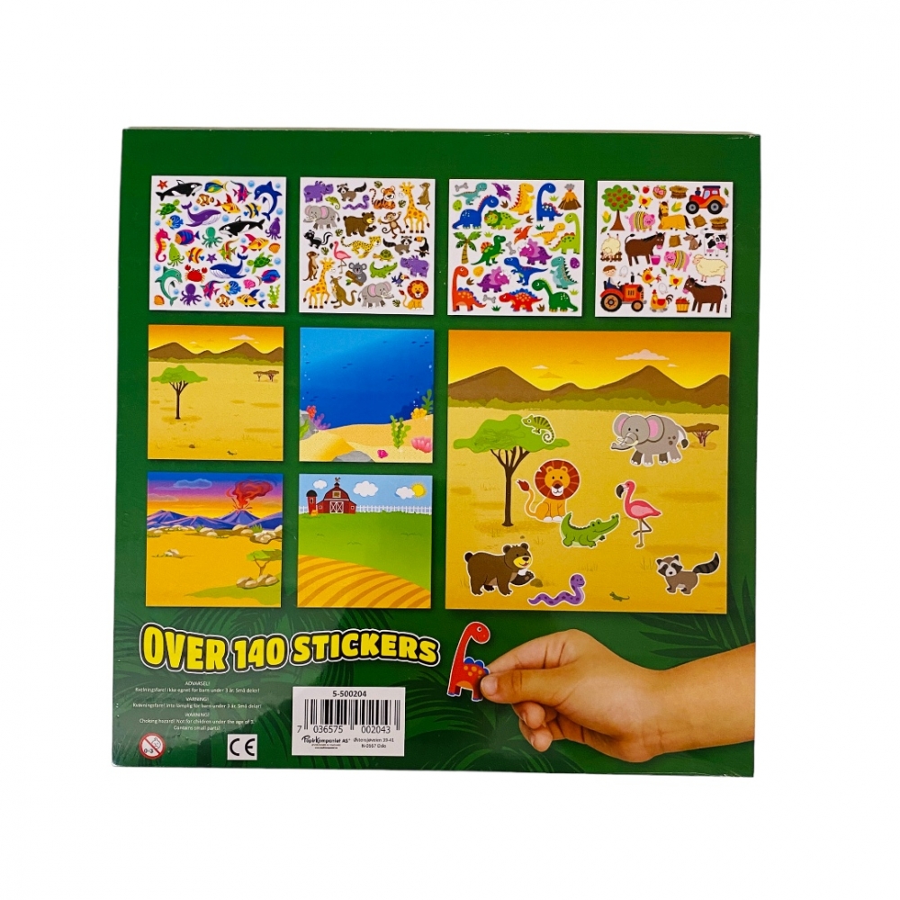 Over 140 spennende stickers på 4 ark a 25x25 cm, med 4 temaer: Dinosaur,ville dyr, havdyr og gårdsdyr, samt 4 ark på 25x25 cm med motiv, til å klistre på. Her er det bare å slippe kreativiteten løs.