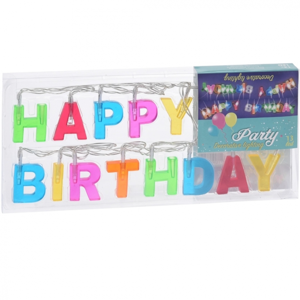 Lekker LED-girlander, Happy Birthday, som gir den rette stemningen på bursdagen. Bruker 2 stk. AA batterier, 1,5 v, som følger med