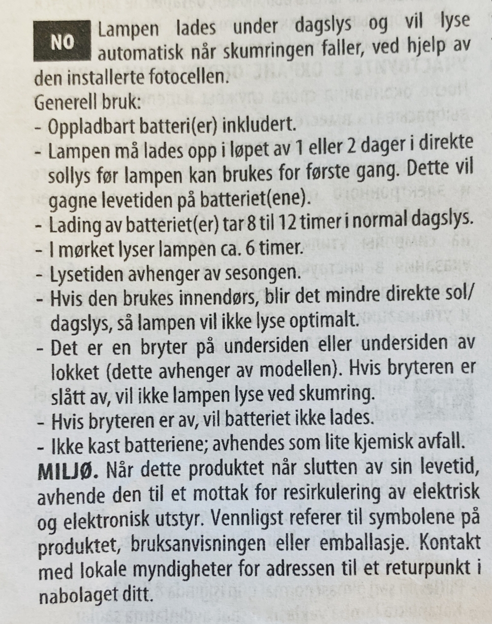 Lekker solarlampe på 23 cm i diameter, som lyses opp av 3x4 LED lys. (Varm hvite) Kommer med opphengs-snor og krok for oppheng. Bruker 1 stk. oppladbart batteri AAA 200 mAh 1,2 v, som er inkludert. Denne vil garantert skape stemning på sommerfesten