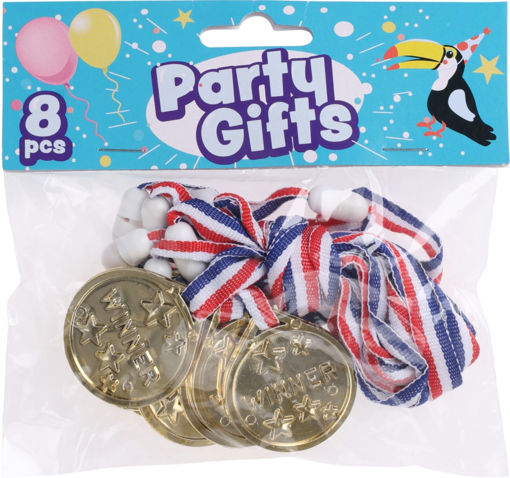 8 "gullmedaljer" med snor i rødt, hvitt og blått. Utløsermekanisme på snoren, for å unngå kvelning når barn bruker de. Ikke anbefalt for barn under 3 år.