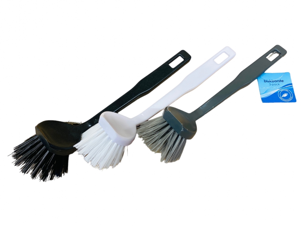 Oppvaskbørster 3 pk. (Innerkartong 12 stk) PrisNOK9,00 ekskl. mva. Kjøp 3 oppvaskbørster i ass. farger. Grå, hvit og sort.