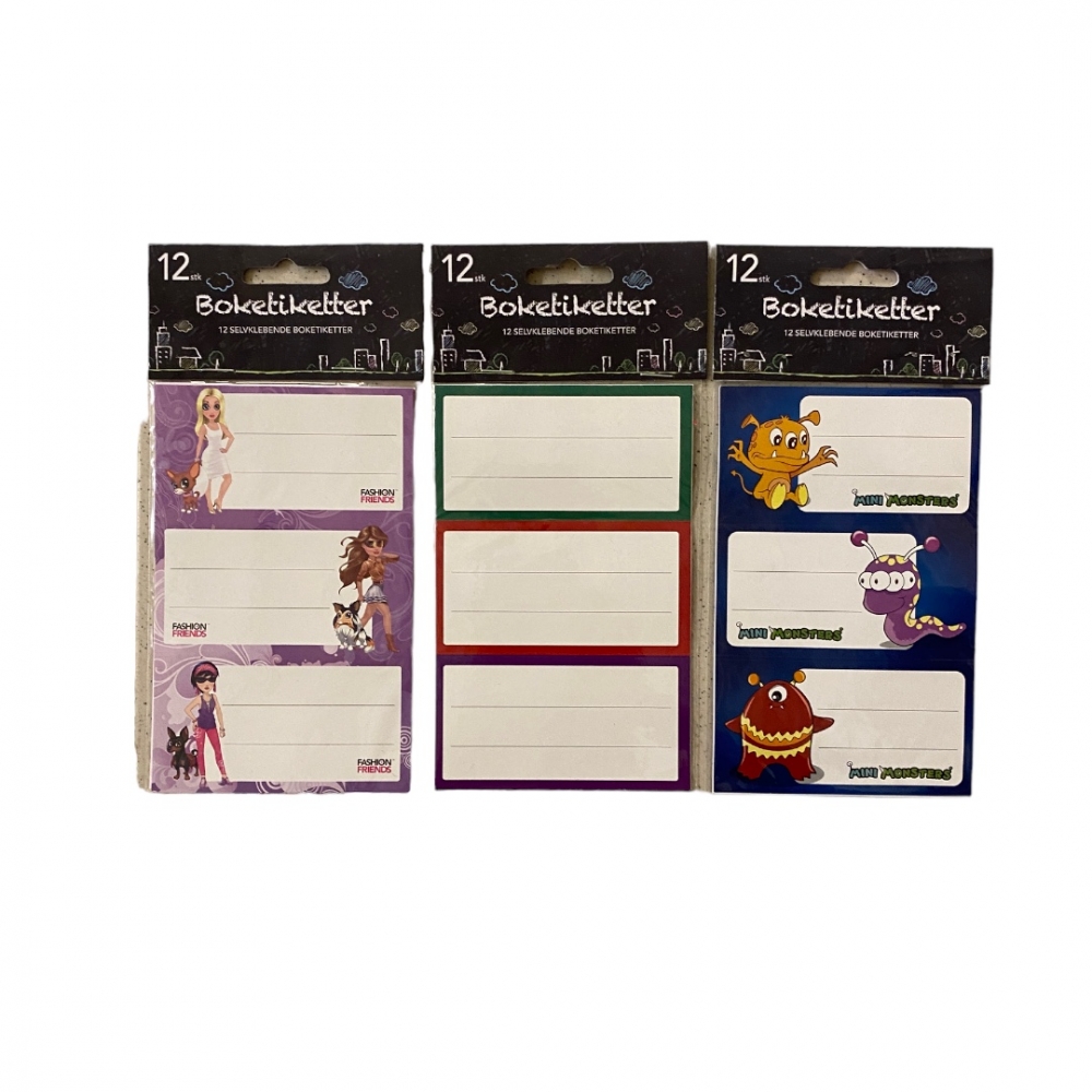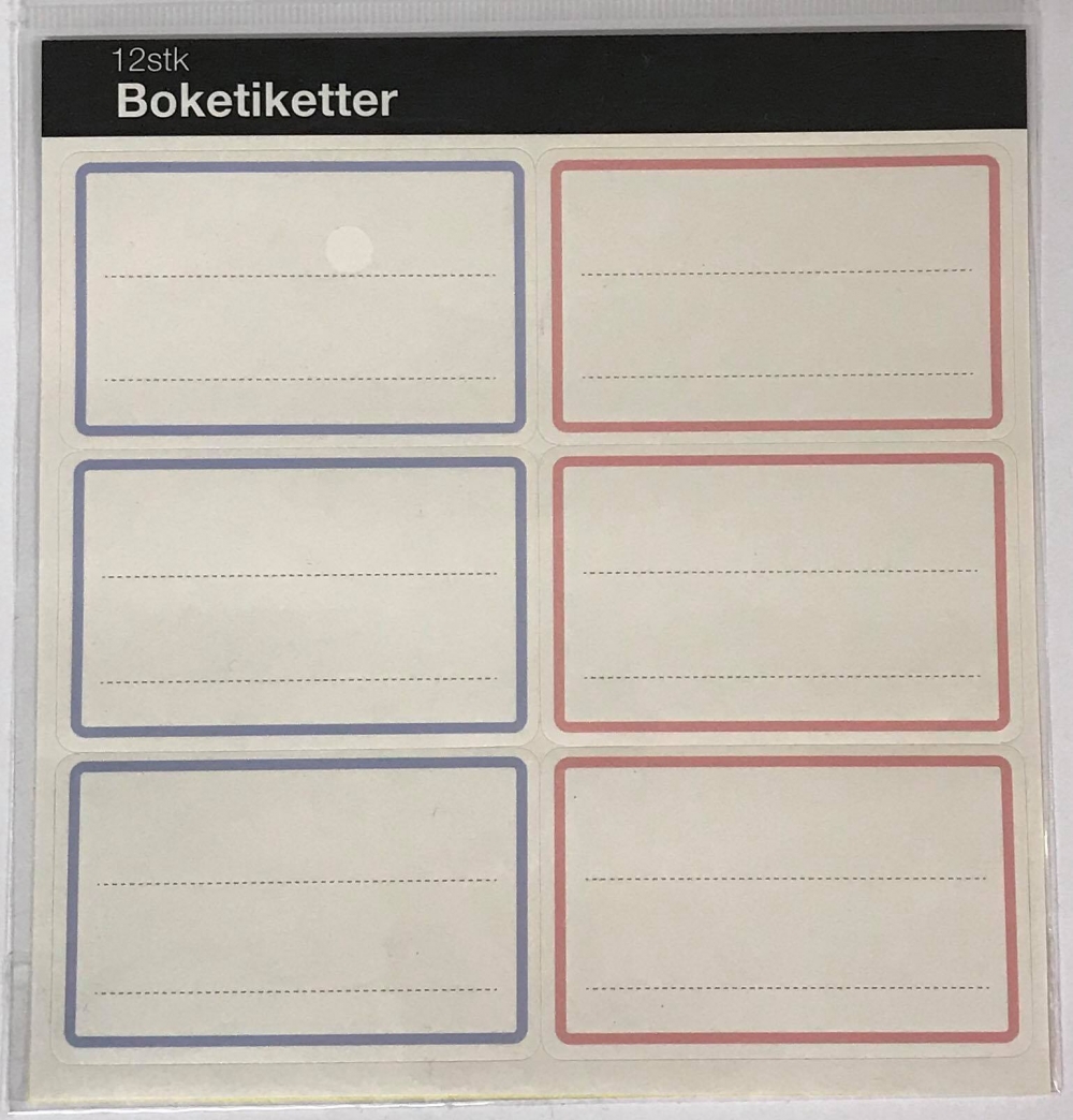 Boketiketter 12stk - 3 ass. (Innerkartong 6 stk) PrisNOK4,00 ekskl. mva. Kjøp Til bokbind i papir og andre ting som skal merkes.