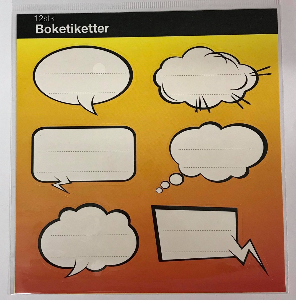 Etiketter/boketiketter 12stk - snakkebobler (Innerkartong 25 stk) PrisNOK5,00 ekskl. mva. Kjøp Passer til å klistre på bøker og andre ting du vil merke med navn. (obs! kleber dårlig på elastiske boktrekk, se våre andre produkter beregnet på disse)