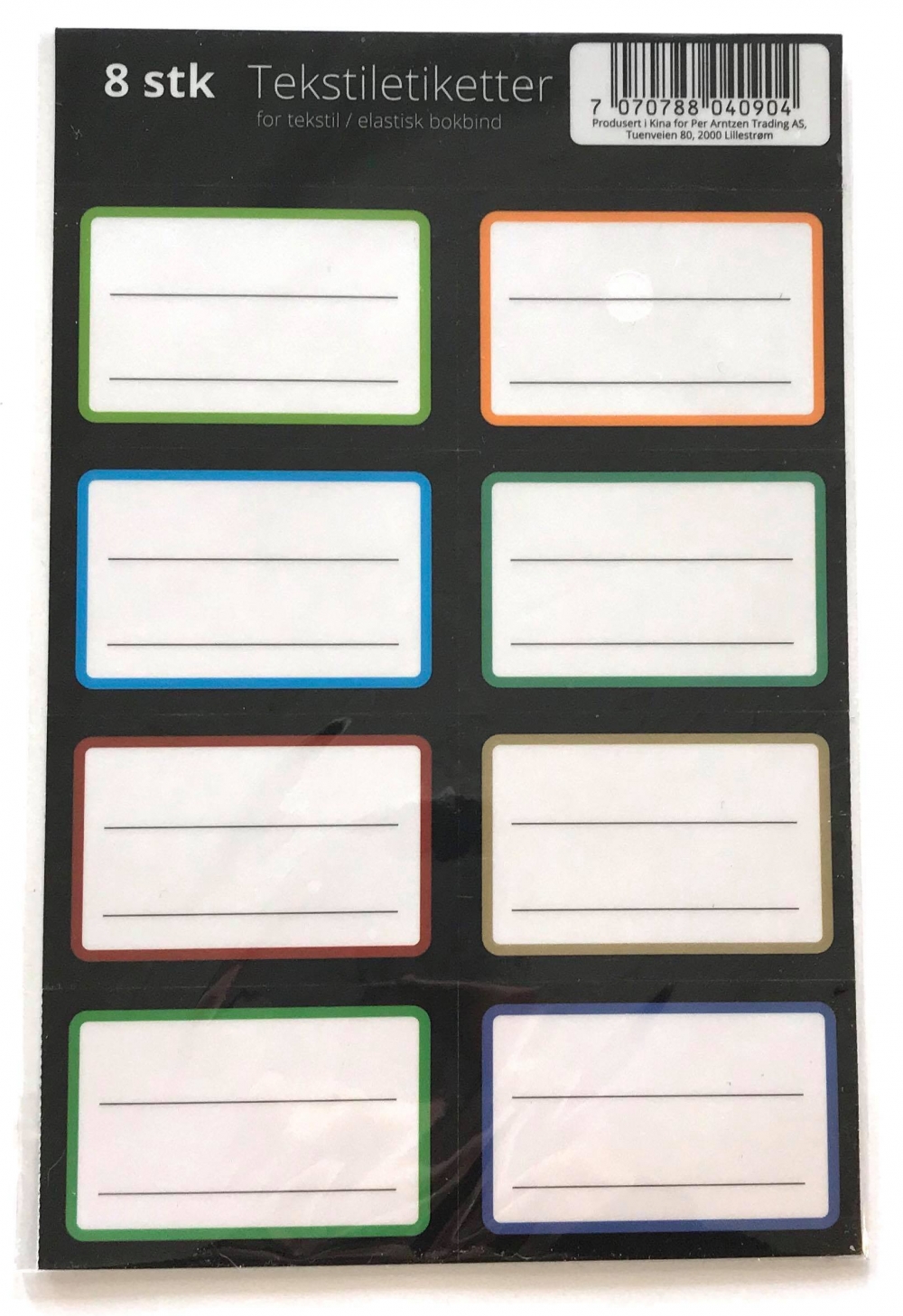 Tekstiletiketter 8pk - Sort og grønn/orange ass. (Innerkartong 24 stk) PrisNOK5,00 ekskl. mva. Kjøp Tekstiletiketter til tekstil/elastiske bokbind.