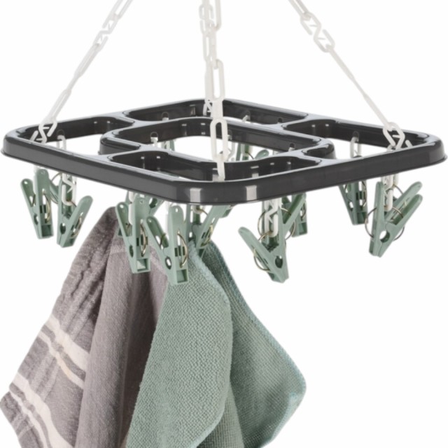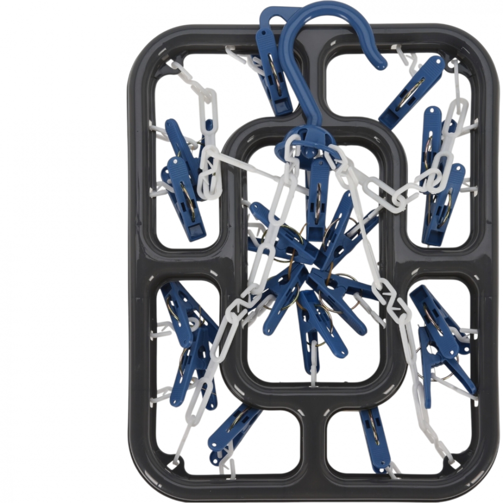 Dette praktiske klesstativet med hele 18 klesklyper, hold klesvasken organisert. Med en kompakt og plassbesparende design, er den ideell for både hjemmebruk, camping og reiser. Ca. 31x24 cm