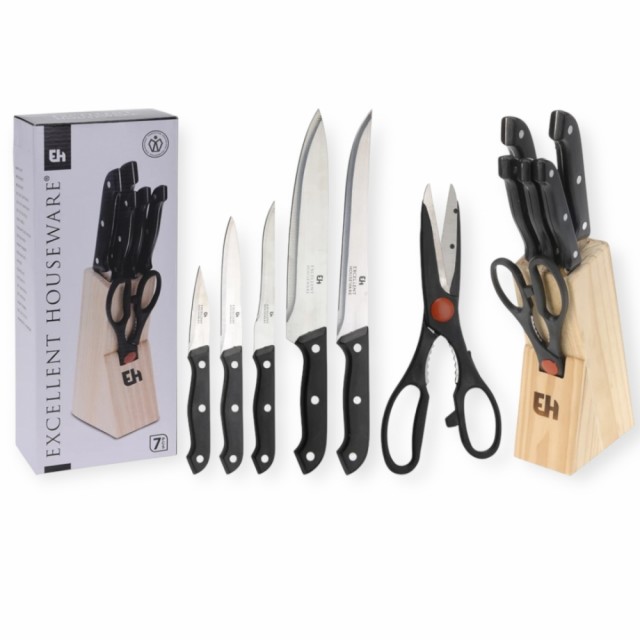 Flott knivblokk med 5 kniver og saks, fra Excellent Houseware, som inneholder følgende kniver: utskjæringskniv, kokkekniv, verktøykniv, utbeningskniv og skjærekniv, som gjør at du har det perfekte verktøyet for enhver oppgave.
