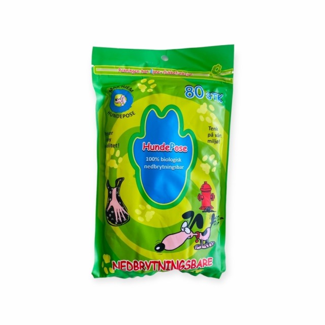 Hele 80 kvalitets-hundeposer med knyting i 100% biologisk nedbrytbart materiale. Det betyr at den brytes ned i løpet av noen måneder. Pakningen har åpne-/lukkefunksjon.