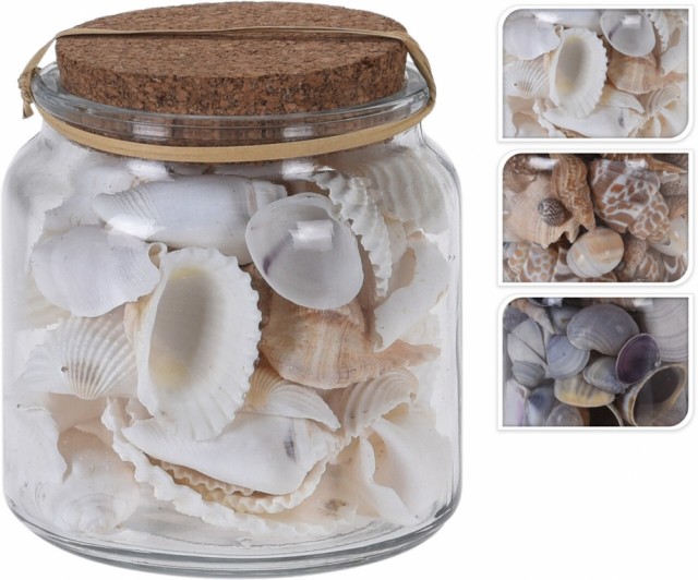 Sjø-shell og snilehus som kommer i en lekker glasskrukke lokk av kork. Dette er en flott dekorasjon i seg selv, men innholdet kan også brukes til å dekorere andre steder. Fargene kan variere. Krukken er ca.11 cm høy og ca. 10 cm i diameter.