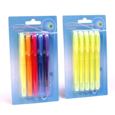 5stk markeringstusjer. Velg mellom klassiske gule eller fem ulike friske farger, praktisk for å sortere informasjon i ulike temaer.