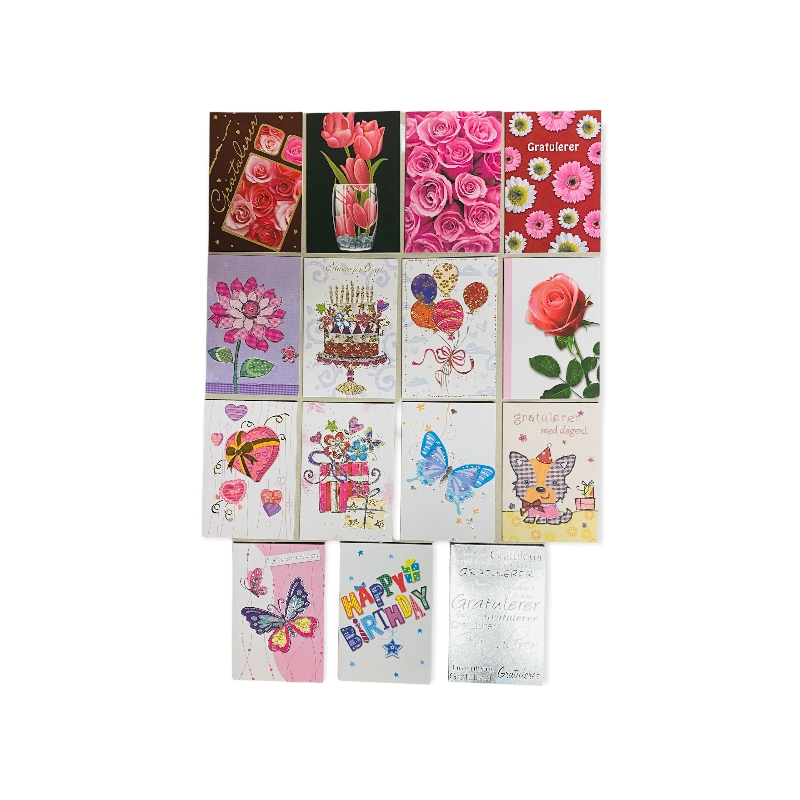 Gratulasjonskort doble med konvolutt 24 stk. E3 med oppheng (Innerkartong 1 assortiment)