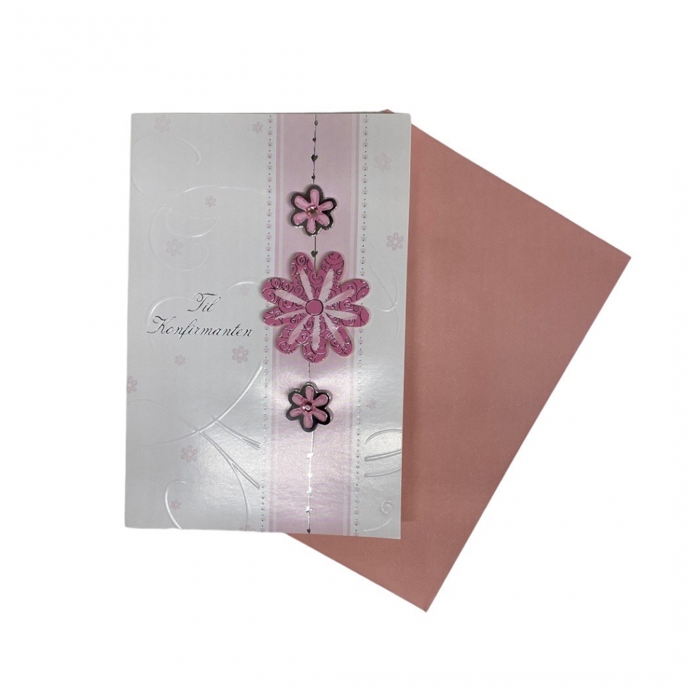 Flott konfirmasjonskort med pålimte detaljer (3D-effekt), pengelomme og rosa konvolutt.