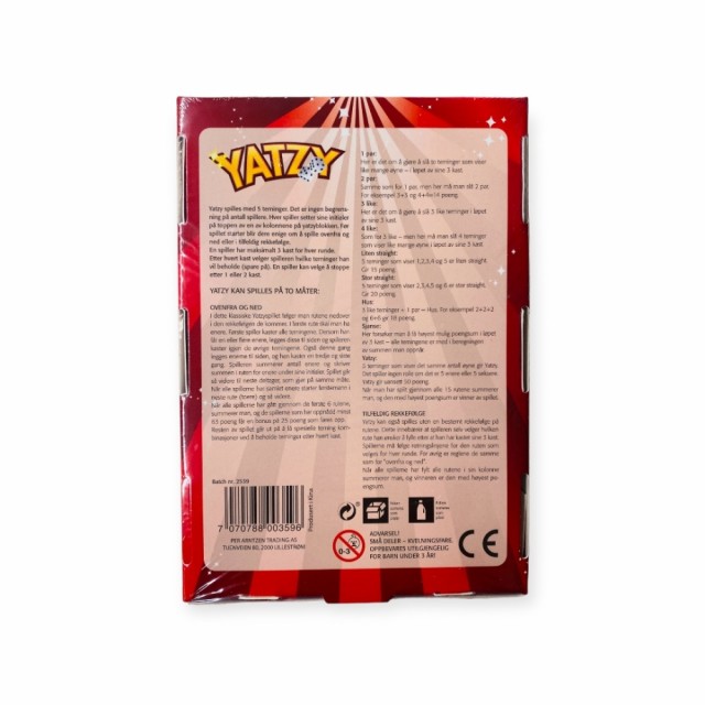 Yatzy (Innerkartong 12 stk) Klassisk Yatzyspill bestående av: Yazyblokk med 5 terninger og spilleregler. PrisNOK14,00 ekskl. mva. På lager: 84 stk. Antall Kjøp Ønskeliste Lagerstatus: På lager: 84 stk. Artikkelnr.: 2H123 Del dette Produktinfo Produktanmeldelser (0) Spilleregler medfølger! Skriv en produktanmeldelse og del dine erfaringer med dette produktet med andre kunder. Email Navn Din vurdering? 1 star 2 star 3 star 4 star 5 star 6 star Oppgi en tittel for anmeldelsen din Skriv inn produktanmeldelsen i feltet under