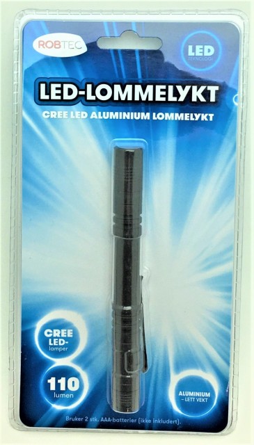 Praktisk lommelykt som bare er litt tykkere enn en kulepenn, med klype på siden, for å feste i lommer etc. Ca. 14 cm lang. Cree-LED Teknologi. Aluminium som gir lett vekt. 110 Lumen. Bruker 2 stk. AAA batterier, (ikke inkludert)